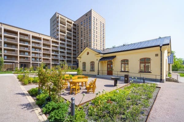 Hållbarhet har i bred bemärkelse präglat projektet från start. Genom att omforma den ursprungliga planen från enbart ettor till fler delningsbostäder ökade antalet boende med 40 procent – utan att byggnadsvolymen växte – vilket minskade klimatpåverkan per person med nästan 30 procent. Återbrukade byggnader, solceller, effektiv dagvattenhantering och system för värmeåtervinning förstärker den ekologiska profilen. Projektet är certifierat enligt Miljöbyggnad 3.1 Silver, med Guld för energi och dagsljus.